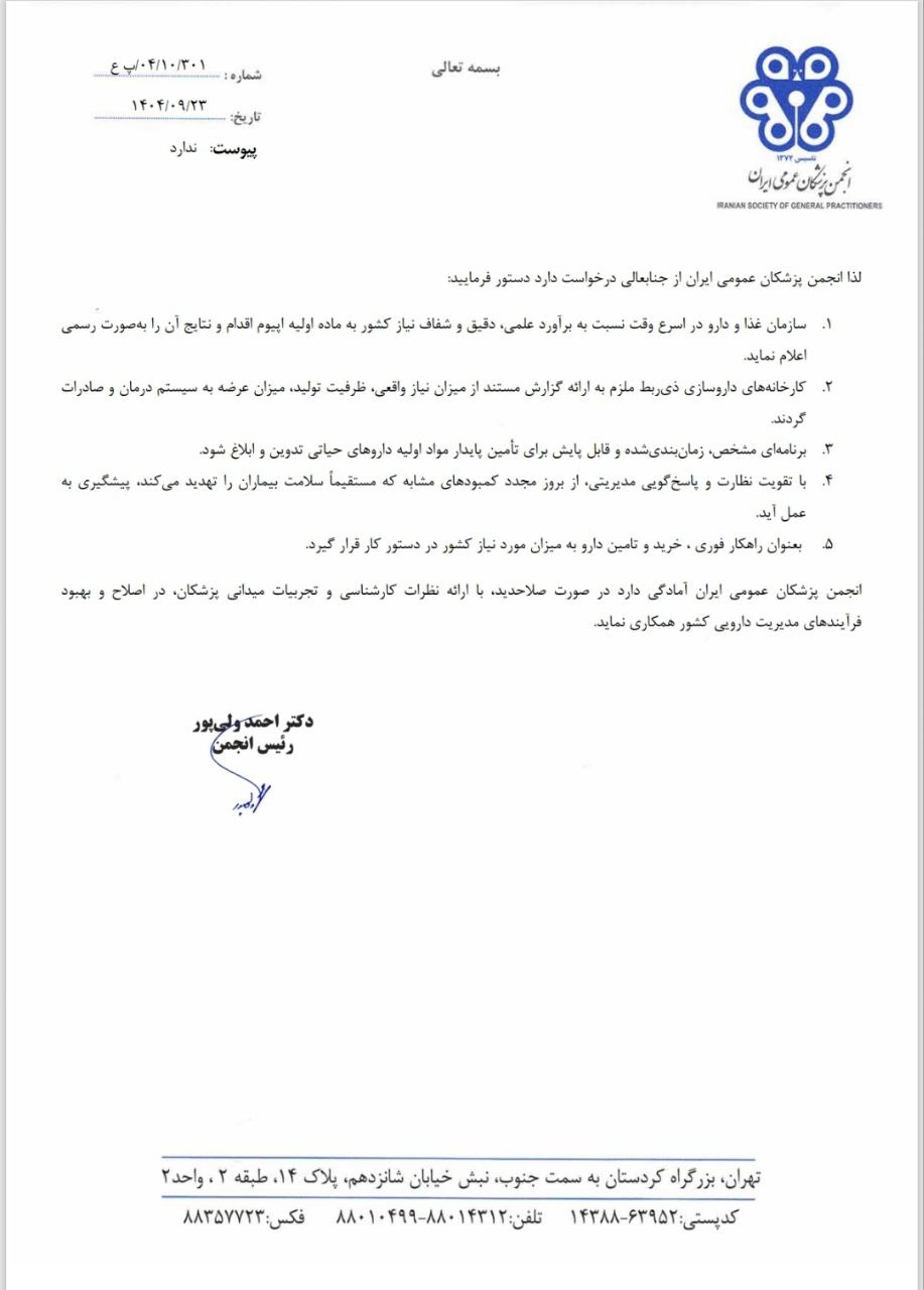 انجمن پزشکان عمومی ایران ضمن اعلام آمادگی برای همکاری کارشناسی، تأکید کرده است که تداوم این وضعیت میتواند اعتماد بیماران و جامعه درمان به نظام دارویی کشور را بهطور جدی خدشهدار کند.