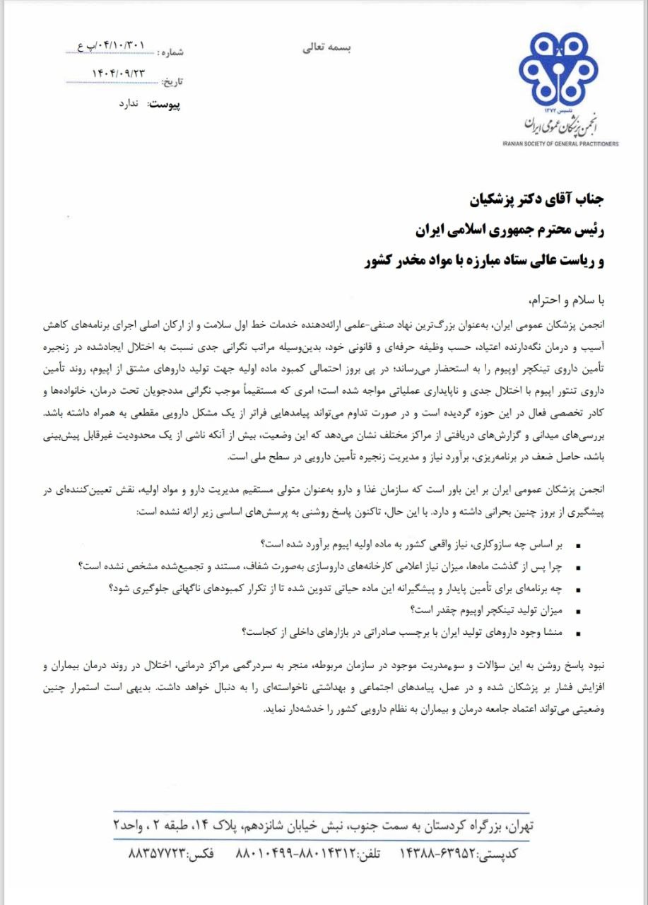 انجمن پزشکان عمومی ایران در نامهای رسمی خطاب به دکتر مسعود پزشکیان، رئیسجمهور و رئیس عالی ستاد مبارزه با مواد مخدر، نسبت به اختلال جدی در زنجیره تأمین داروی حیاتی تینکچر اوپیوم هشدار داد.