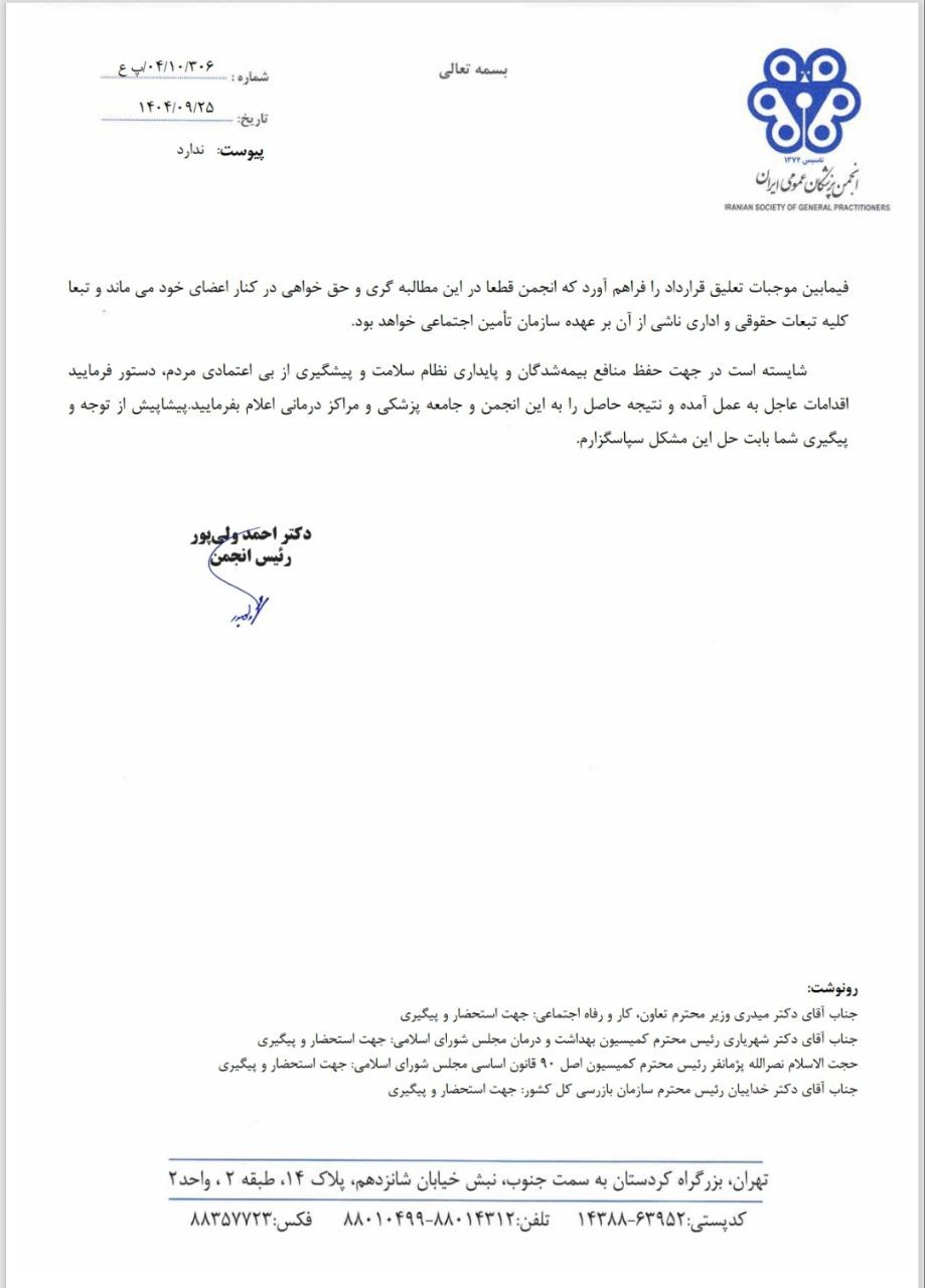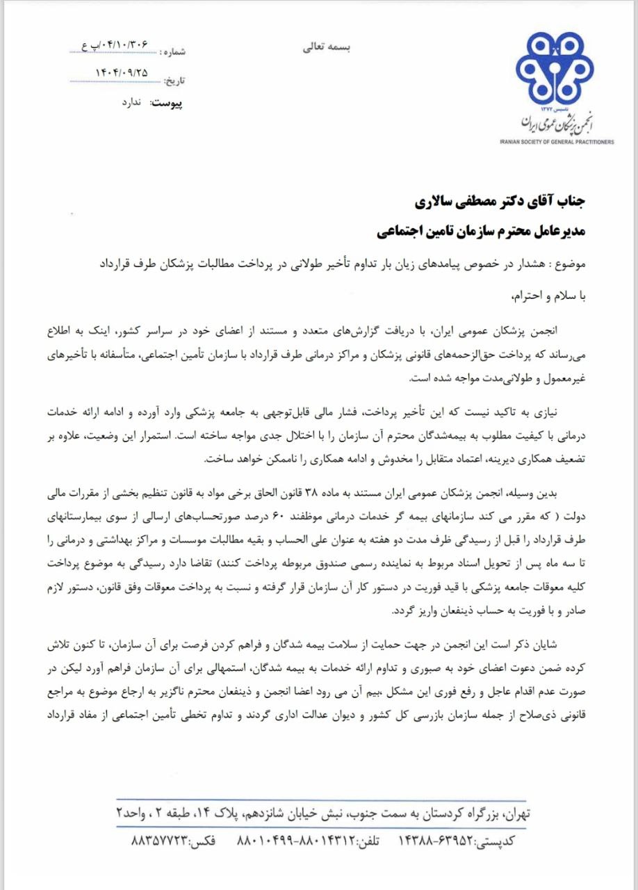 لازم به ذکر است که پیش‌تر انجمن پزشکان عمومی ایران طی نامه‌ای به سازمان تأمین‌اجتماعی خواستار به‌روزرسانی پرداخت‌ها و تسویه کامل مطالبات پزشکان طرف قرارداد با این سازمان شده
