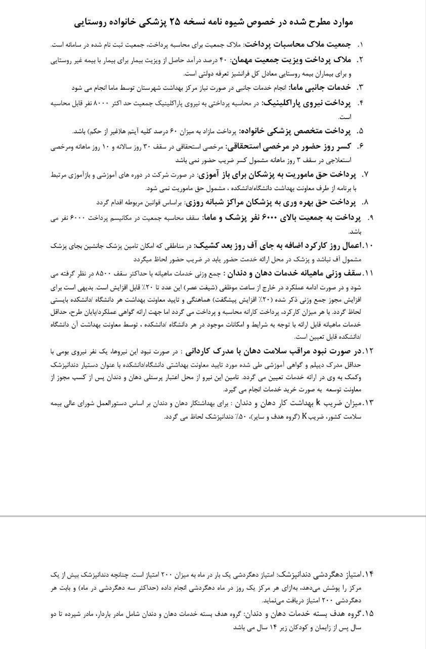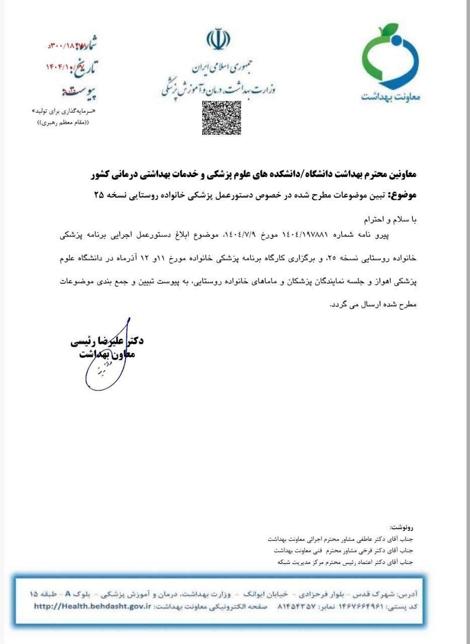 معاونت بهداشت وزارت بهداشت طی نامهای رسمی، جمعبندی نکات اجرایی و مالی نسخه ۲۵ برنامه پزشکی خانواده روستایی را به دانشگاههای علوم پزشکی کشور ابلاغ کرد.