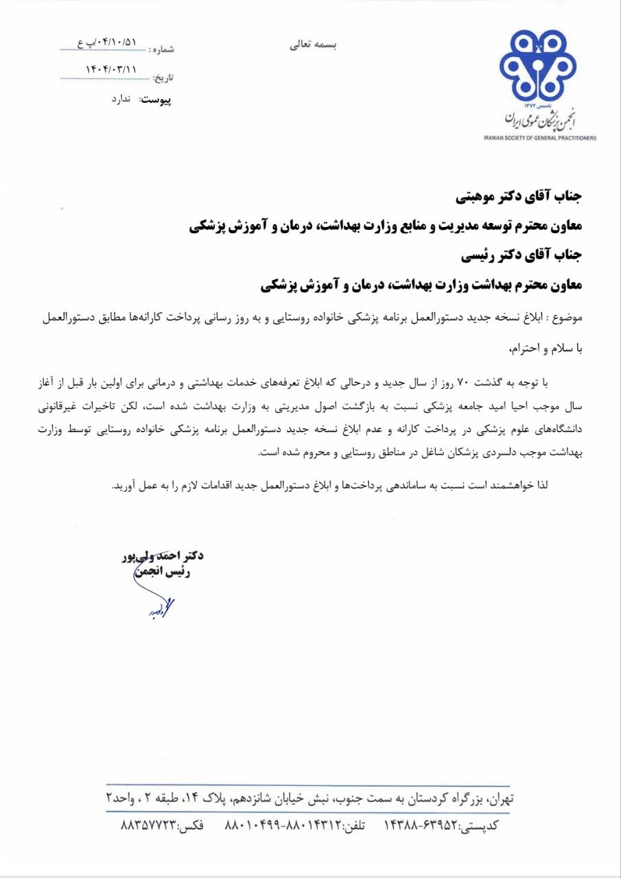 در این نامه آمده است: «با وجود آنکه تعرفههای خدمات درمانی، برای نخستین بار پیش از آغاز سال ابلاغ شد و این امر موجب امیدواری جامعه پزشکی نسبت به بازگشت اصول مدیریتی به وزارت بهداشت گردید، اما تأخیر در ابلاغ دستورالعمل سال جدید برنامه پزشکی خانواده روستایی و نیز تأخیر چند ماهه پرداخت کارانهها، سبب دلسردی پزشکان شاغل در مناطق روستایی و محروم شده است.»