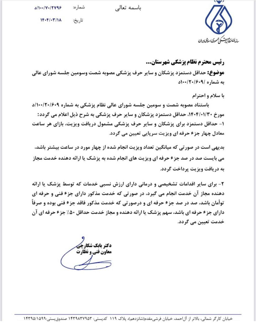 ابلاغ حداقل دستمزد پزشکان شاغل در مراکز درمانی توسط سازمان نظام پزشکی