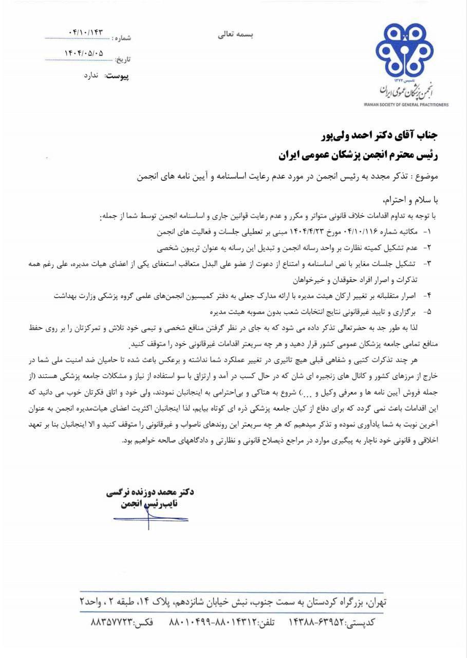 افزون بر این، مطابق رویه ثابت انجمن، در مکاتبات داخلی هرگز رونوشت به نهادهای بیرونی درج نمیشود. بررسیهای فنی نشان میدهد بخشهایی از متن پایانی با فرمت و ساختاری متفاوت به سند اضافه شدهاند که این امر موجب خدشه در اصالت آن شده است.