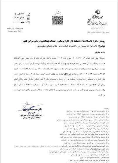 تمدید مهلت ثبتنام در انتخابات سازمان نظام پزشکی/ از تاریخ شنبه ۱۲ مرداد ساعت ۱ بامداد لغایت ساعت ۲۲:۵۹ روز سه شنبه ۱۴ مرداد ۱۴۰۴مدید مهلت ثبتنام در انتخابات سازمان نظام پزشکی/ از تاریخ شنبه ۱۲ مرداد ساعت ۱ بامداد لغایت ساعت ۲۲:۵۹ روز سه شنبه ۱۴ مرداد ۱۴۰۴