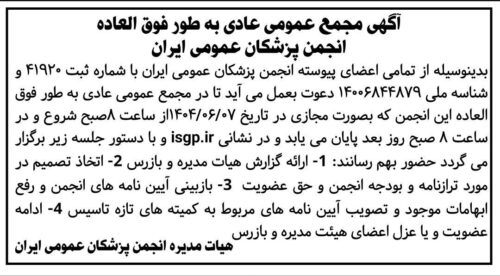 بدینوسیله از تمامی اعضای پیوسته انجمن پزشکان عمومی ایران با شماره ثبت ۴۱۹۲۰ و شناسه ملی ۱۴۰۰۶۸۴۴۸۷۹ دعوت بعمل میآید تا در مجمع عمومی عادی بهطور فوقالعاده این انجمن که بصورت مجازی در تاریخ ۱۴۰۴/۰۶/۰۷از ساعت ۸صبح شروع و در ساعت ۸ صبح روز بعد پایان می یابد و در نشانی isgp.ir و با دستور جلسه زیر برگزار میگردد حضور بهم رسانند: