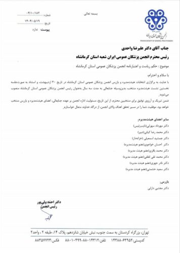 بدین وسیله و با صدور حکم ریاست دکتر علیرضا واحدی، هیئتمدیره منتخب انجمن پزشکان عمومی استان کرمانشاه به صورت رسمی و با ترکیب جدید شروع به کار کرد.