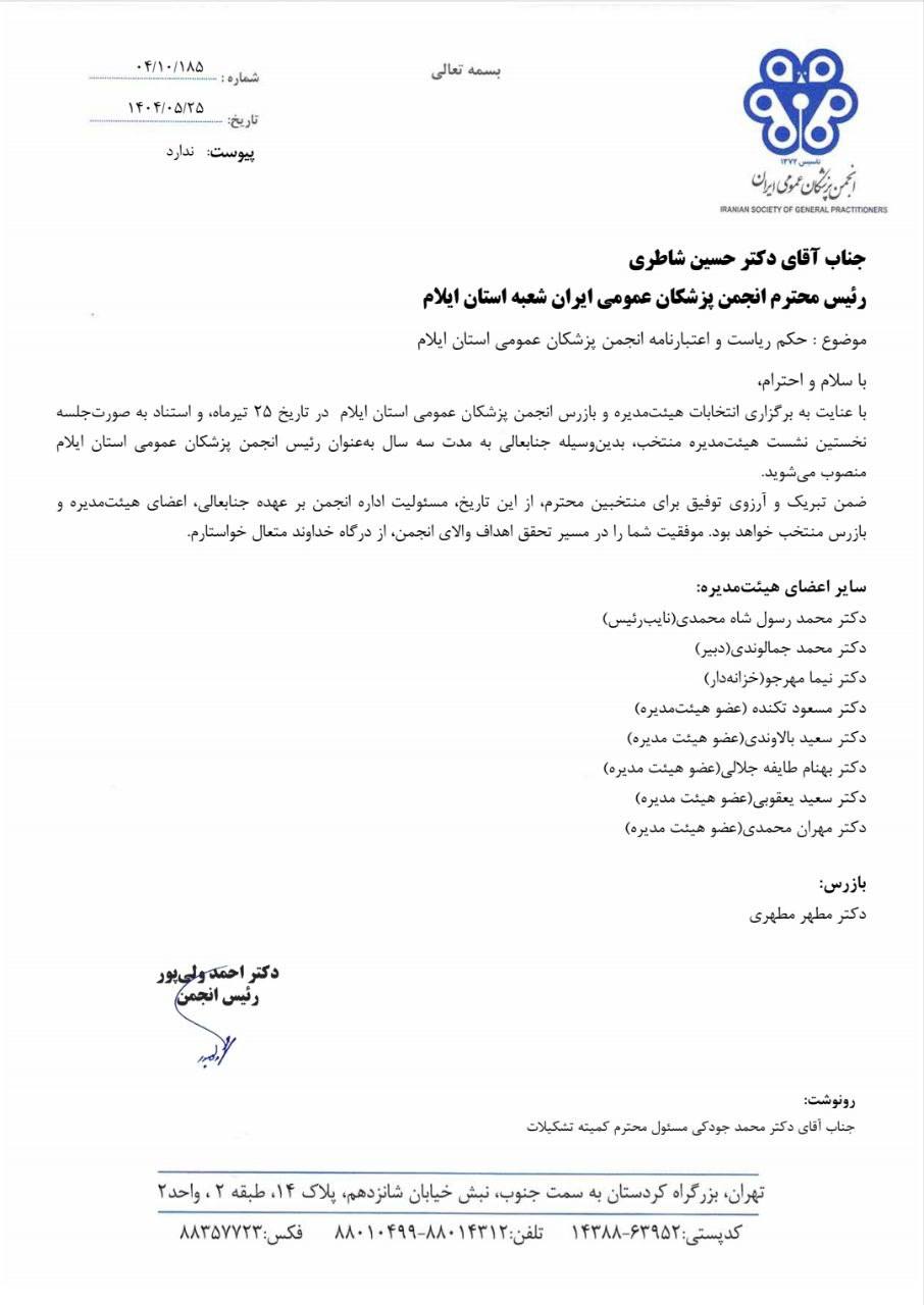 بدین وسیله و با صدور حکم ریاست دکتر حسین شاطری، هیأتمدیره منتخب انجمن پزشکان عمومی استان ایلام به صورت رسمی و با ترکیب جدید شروع به کار کرد