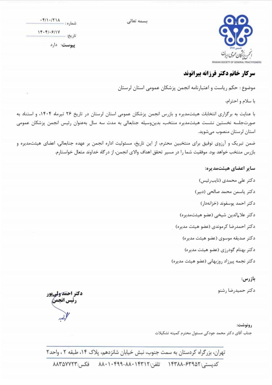 بدین وسیله و با صدور حکم ریاست دکتر فرزانه بیرانوند، هیأت‌مدیره منتخب انجمن پزشکان عمومی استان لرستان به صورت رسمی و با ترکیب جدید شروع به کار کرد.
