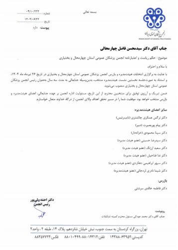 اعضای هیأت رئیسه و خزانه‌دار انجمن پزشکان عمومی استان چهارمحال و بختیاری بدین صورت انتخاب شدند: