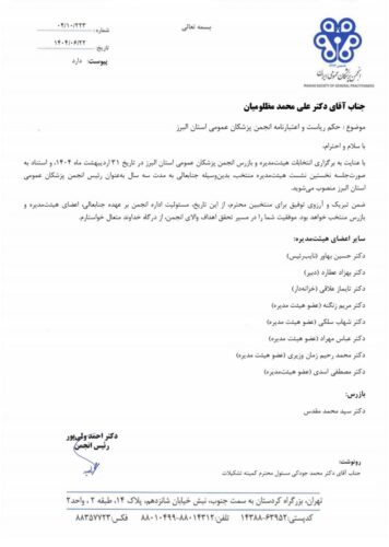 بدین وسیله و با صدور حکم ریاست دکتر علی محمد مظلومیان، هیأت‌مدیره منتخب انجمن پزشکان عمومی استان البرز به صورت رسمی و با ترکیب جدید شروع به کار کرد.