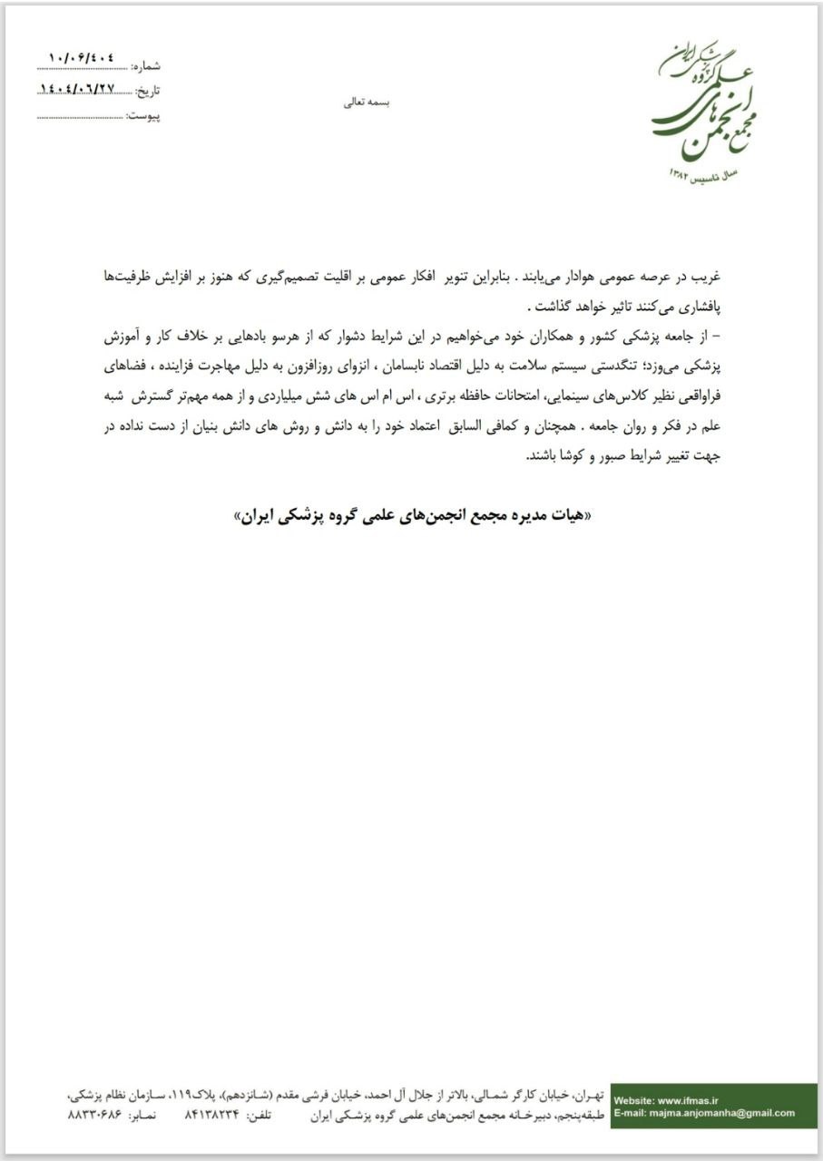 در بخش پایانی این بیانیه، از فعالان رسانه‌ای خواسته شده است با تنویر افکار عمومی و ارتقای آگاهی جامعه نسبت به پیامدهای این تصمیم، نقش مؤثری در حفظ کیفیت آموزش و سلامت مردم ایفا کنند.