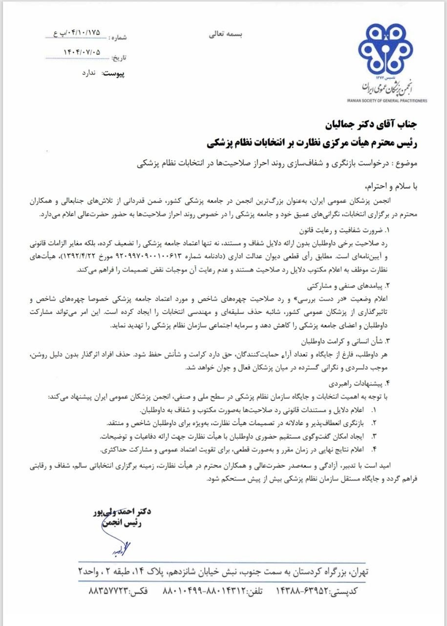 رییس انجمن پزشکان عمومی ایران، بزرگترین انجمن علمی جامعه پزشکی کشور، در نامهای به رییس هیأت مرکزی نظارت بر انتخابات نظام پزشکی، نگرانیهای جدی درباره روند احراز صلاحیتها را مطرح کرد.