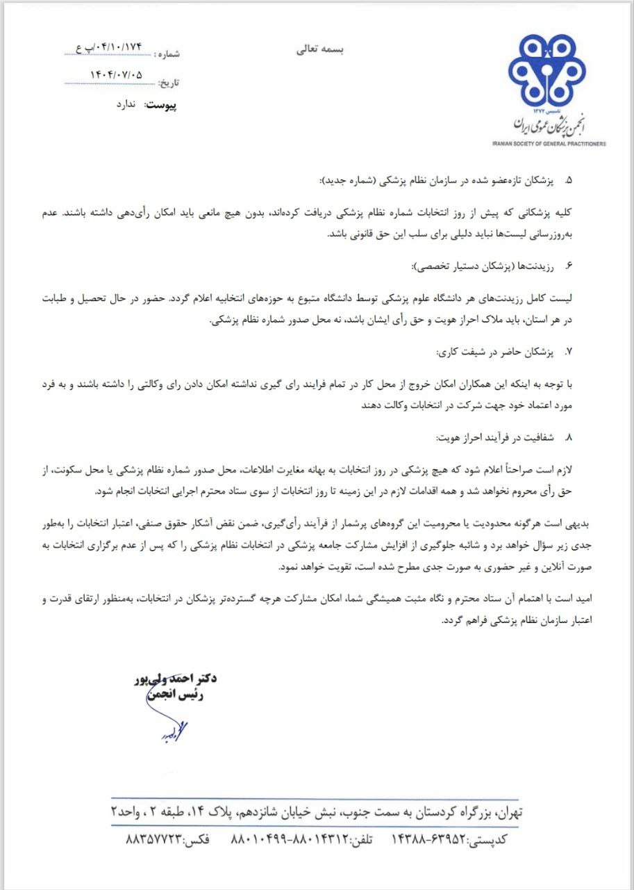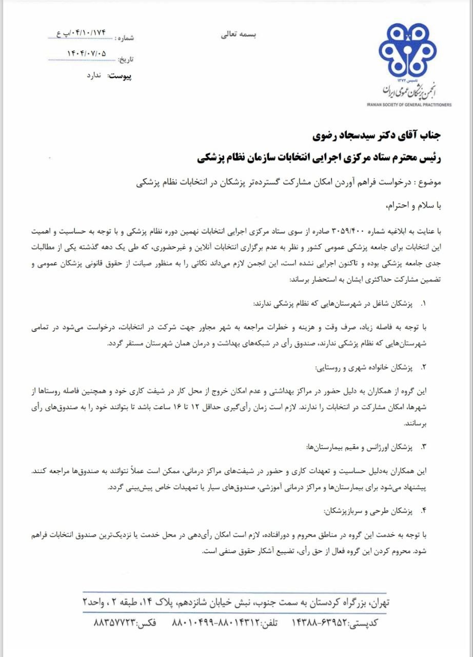 انجمن پزشکان عمومی ایران، با توجه به عدم برگزاری انتخابات نظام پزشکی بهصورت آنلاین، که از مطالبات جامعه پزشکی طی یک دهه گذشته بوده است، در نامهای خطاب به دکتر سید سجاد رضوی، رییس ستاد مرکزی اجرایی انتخابات نظام پزشکی، خواستار ایجاد تسهیلات لازم برای مشارکت حداکثری پزشکان در این انتخابات شد.