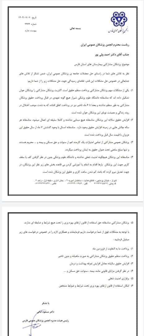 در پی مکاتبات انجمن پزشکان عمومی فارس با ریاست کل انجمن پزشکان عمومی ایران، نامهای رسمی خطاب به وزارت بهداشت و سازمانهای مرتبط ارسال شد.