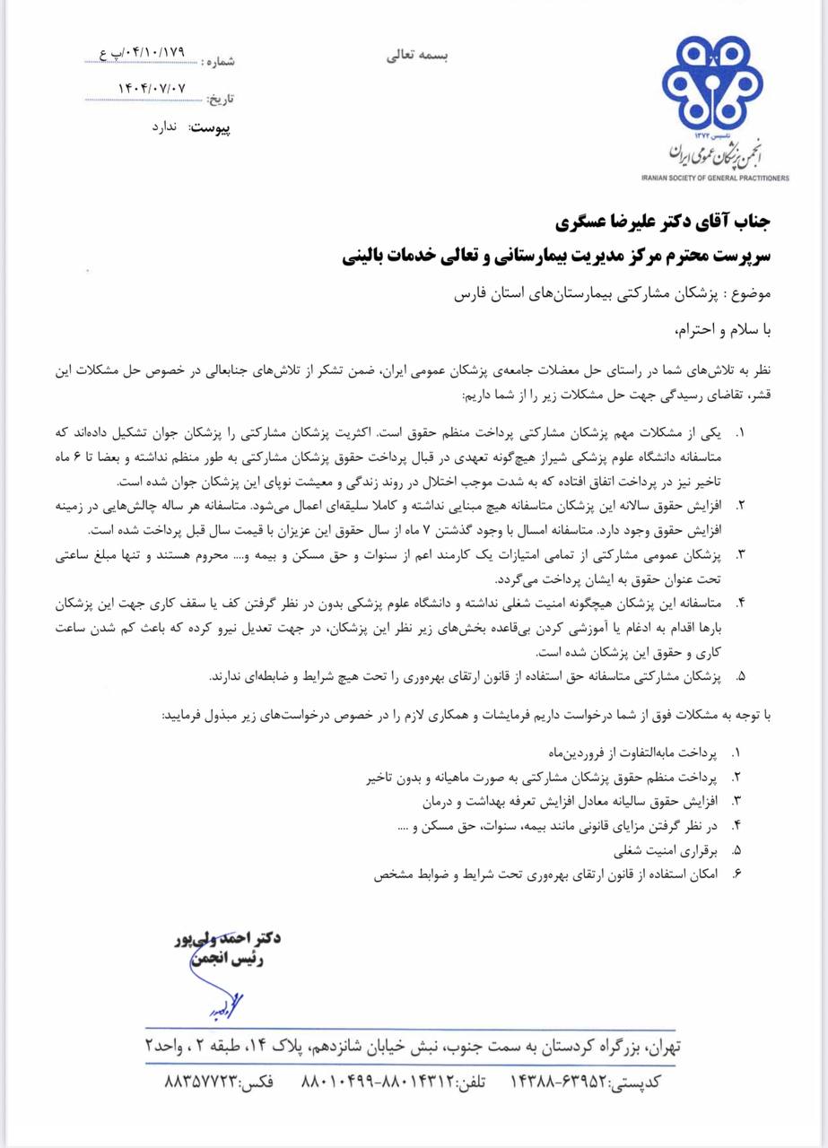 در این نامه، مجموعهای از مشکلات و مطالبات پزشکان عمومی استان فارس و سراسر کشور بهطور مستند مطرح و بر لزوم رسیدگی فوری تأکید شده است.