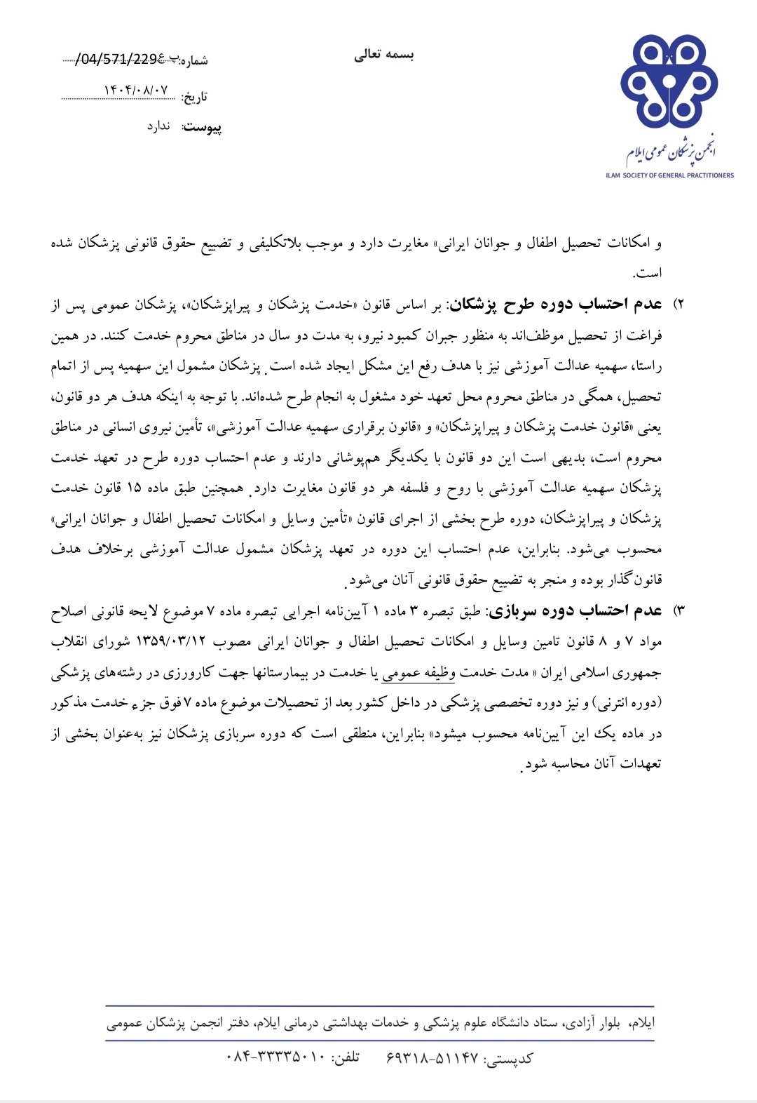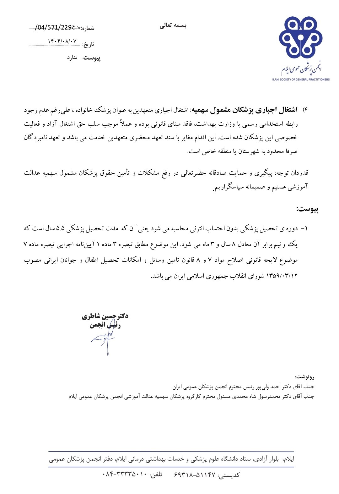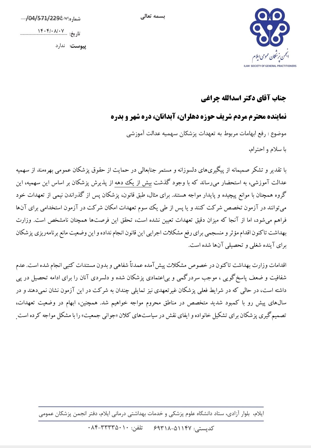 نامه انجمن پزشکان عمومی استان ایلام، به دکتر اسدالله چراغی، نماینده مجلس شورای اسلامی