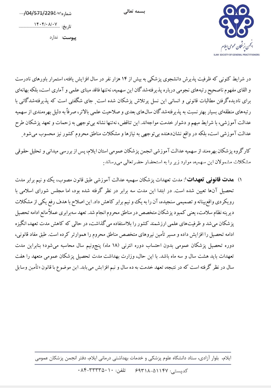 انجمن پزشکان عمومی استان ایلام، در نامه‌ای به دکتر اسدالله چراغی، نماینده محترم مجلس شورای اسلامی و عضو کمیسیون بهداشت و درمان، خواستار پیگیری مشکلات پزشکان بهره‌مند از سهمیه عدالت آموزشی شد.
