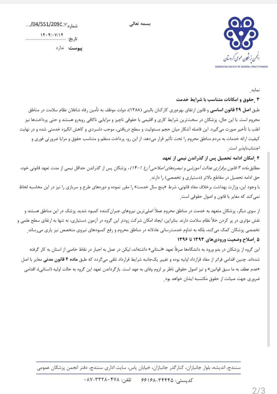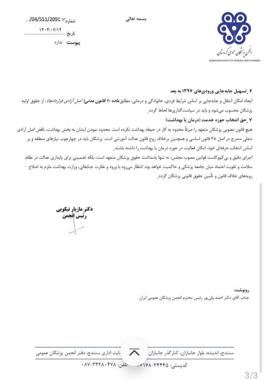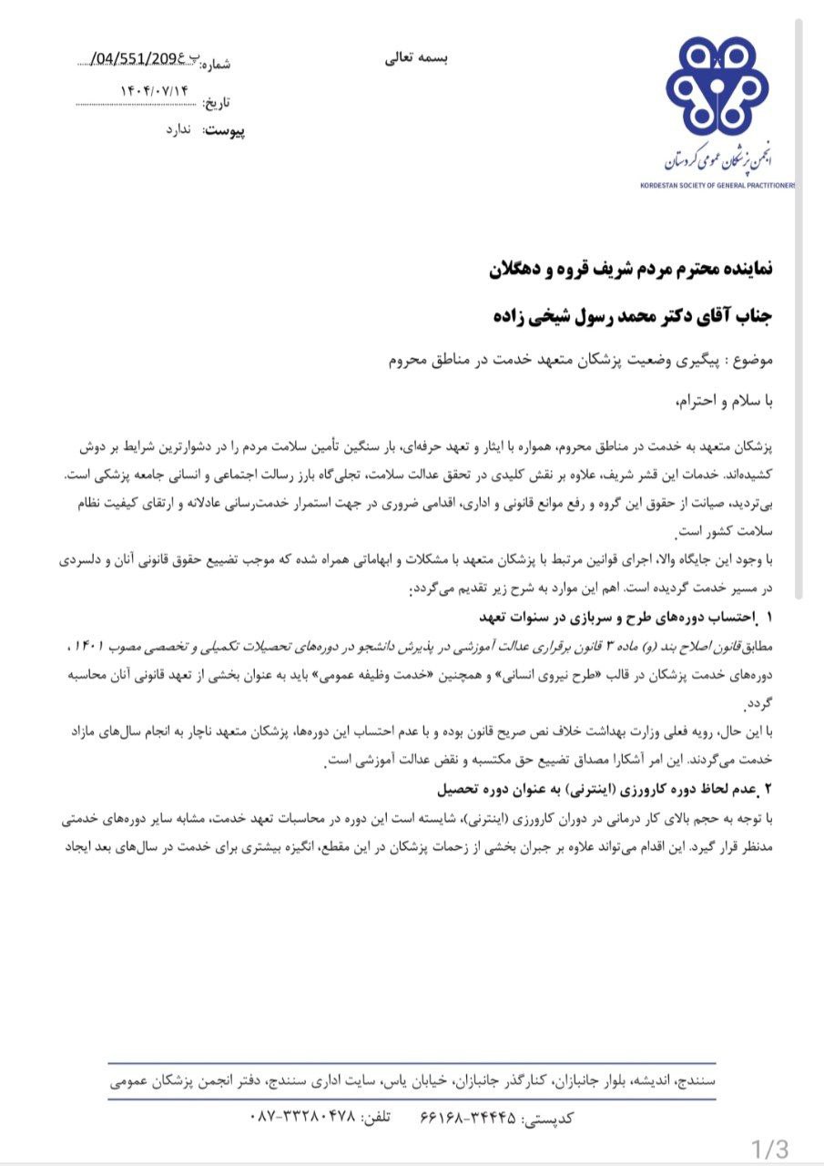 انجمن پزشکان عمومی استان کردستان طی نامه‌ای رسمی خطاب به دکتر رسول شیخی‌زاده، نماینده محترم مردم شریف قروه و دهگلان و دبیر کمیسیون بهداشت مجلس شورای اسلامی، خواستار رسیدگی فوری و عادلانه به مشکلات پزشکان متعهد خدمت شد.