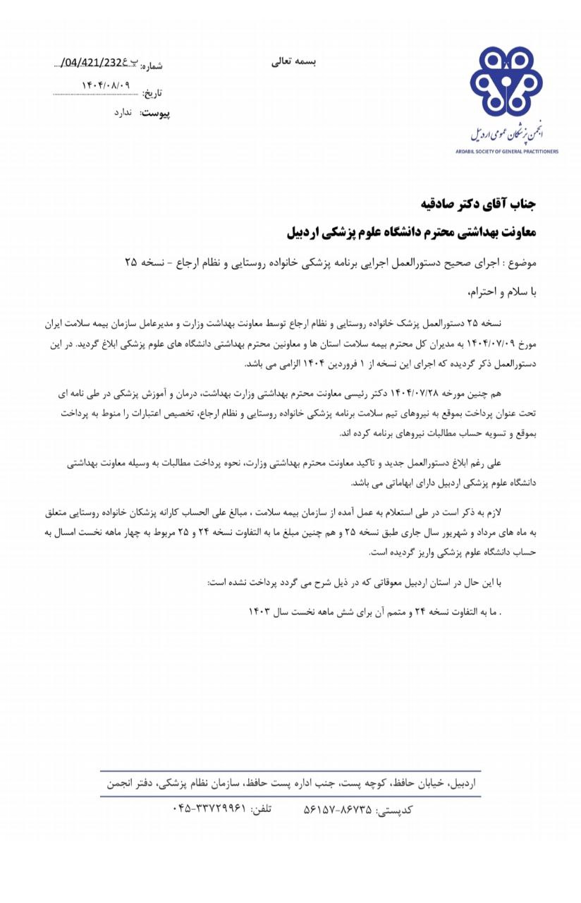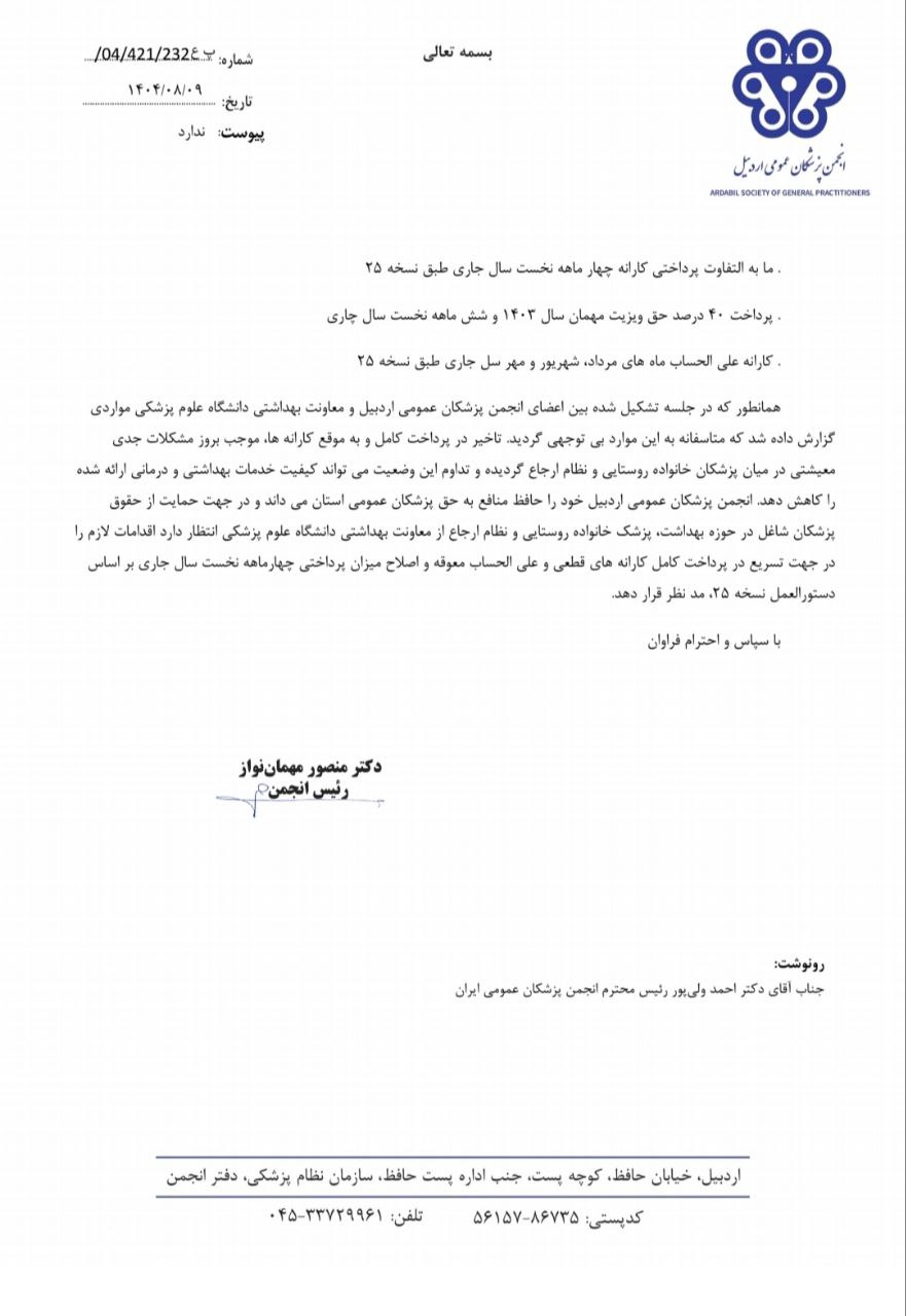 دکتر منصور مهمان نواز رییس انجمن پزشکان عمومى اردبیل در طى نامهاى به دکتر صادقیه معاونت محترم بهداشتى دانشگاه علوم پزشکى اردبیل خواستار اجراى صحیح نسخه ٢۵ برنامه پزشکان روستایى و نظام ارجاع شد. همچنین در این نامه به معوقات معاونت بهداشتى به پزشکان اشاره شده و تداوم این روند را موجب کاهش کیفیت خدمات بهداشتى درمانى ارائه شده ذکر کردند.