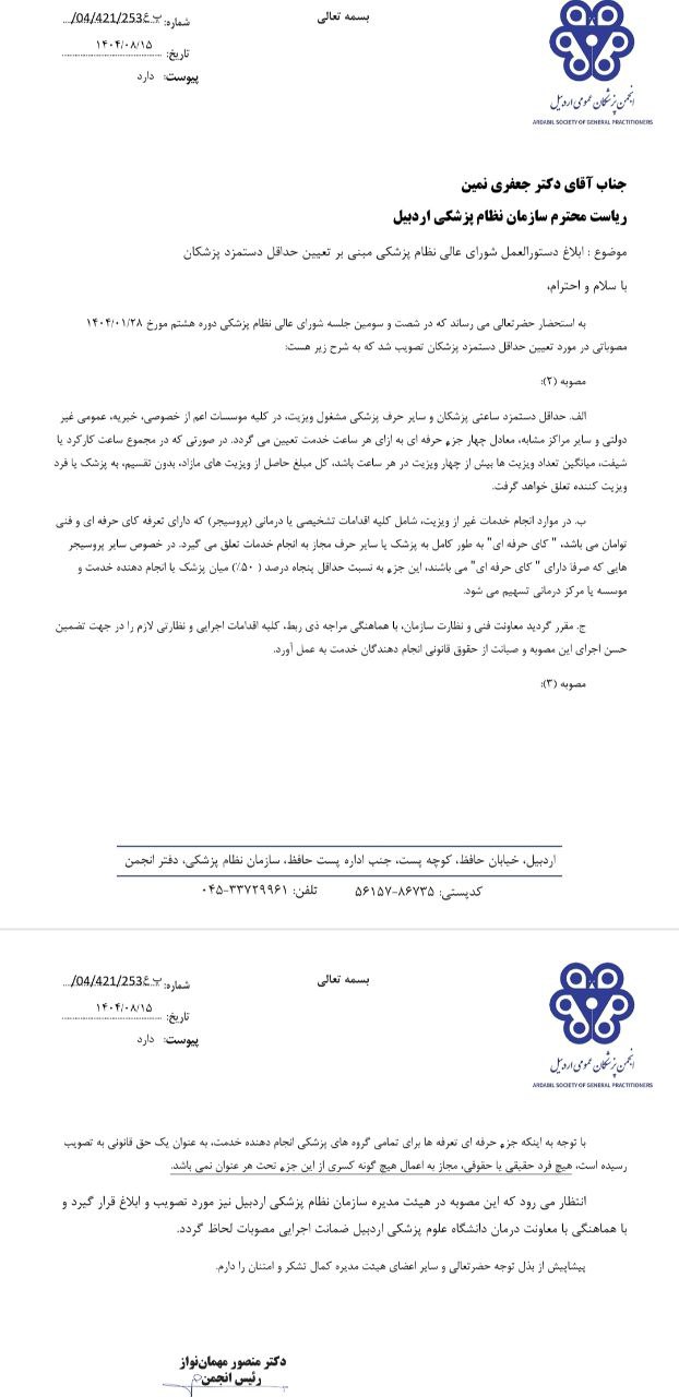 دکتر منصور مهمان نواز، رییس انجمن پزشکان عمومی اردبیل در طی مکاتبه ای خواستار ابلاغ دستورالعمل شورای عالی مبنی بر تعیین حداقل دستمزد پزشکان از سازمان نظام پزشکی اردبیل شد.